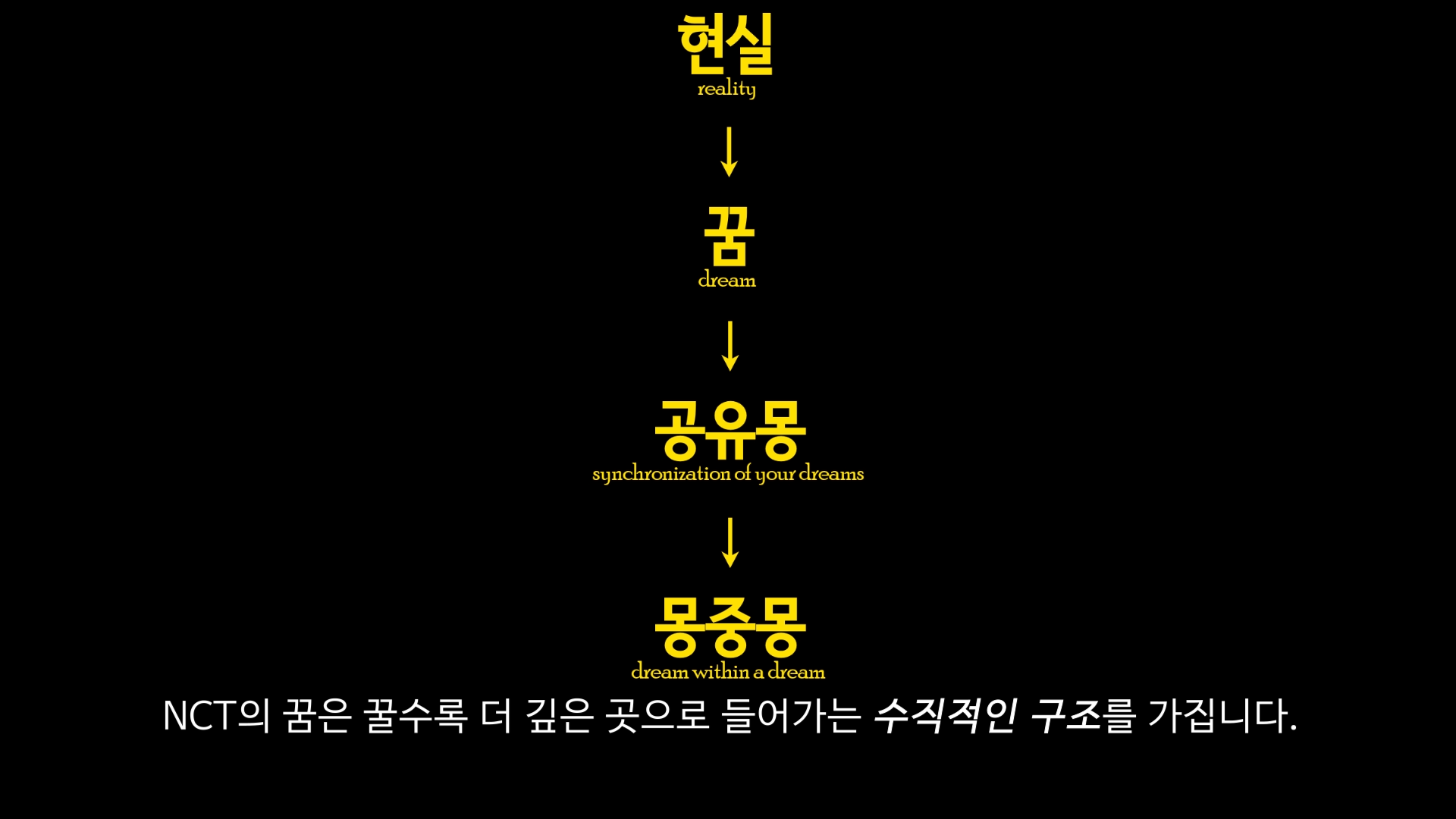 즉, NCT는 { 현실 -> 꿈 -> 공유몽 -> 몽중몽 } 이라는, 꿈에 들어온 이상 갈수록 더 깊어지는 수직적인 꿈의 구조를 갖는다.