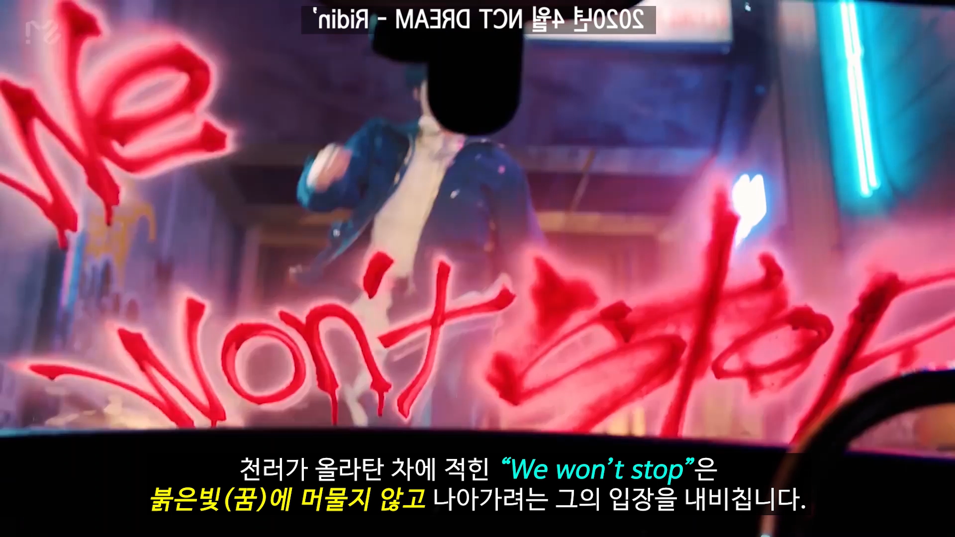 천러가 올라탄 차에 적은 "We won't stop"은, 붉은 불빛(꿈)에 머물지 않고 나아가려는 그의 입장을 내비친다.